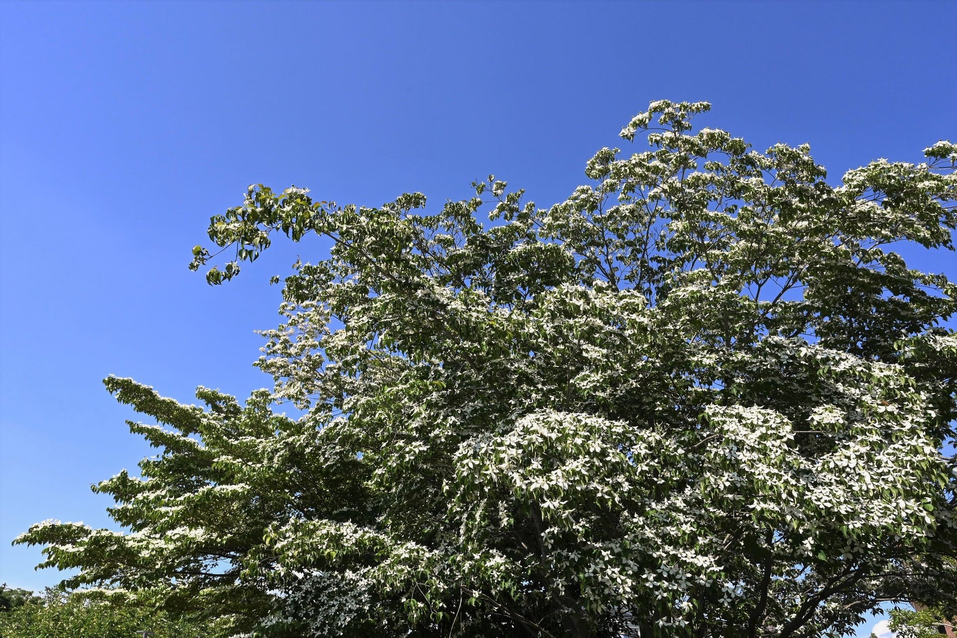 今、公園や庭で空に向かって白い花を咲かせています。ハナミズキの仲間で日本の本州や九州に普通に自生しています。4枚の白い花びらに見える総苞片(花を保護する葉)の先がとがっているところがアメリカハナミズキと違います。