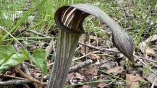 ウラシマソウ 春に仏炎苞を咲かせます。マムシグサとちがって花は葉より下に咲かせます。
