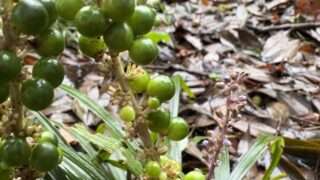 みちくさずかん for Kids ヤブラン NT緑地の歩道の脇にならんで植えられています。夏の終わりから花を咲かせ始めます。花の後に黒っぽい実が出来ます。実の皮がはがれて種子がむきだしになります。 2025.10.20 みちくさずかん for Kidsみちくさ図鑑夏秋