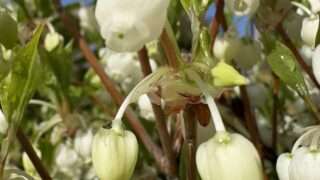 みちくさずかん for Kids スノーフレーク うつむきながら花を咲かせています。スノードロップによく似ていますが花の縁に緑色のドット(てん)がついています。葉はニラに似ていますが毒があり食べられません。